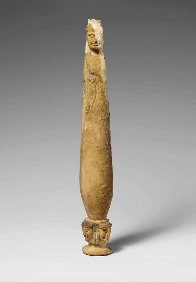 Cut from one piece of stone, the vase consists of the container, in the form of a woman holding a lotos flower, and a base embellished with four female heads. The work is an Etruscan response to perfume flasks with the busts of women that originated in the Near East and spawned adaptations in Cyprus, East Greece, and Etruria. The concept of decorating four sides of a vessel ultimately derives from the East as well. Related works are exhibited in the Belfer Court on the main floor.