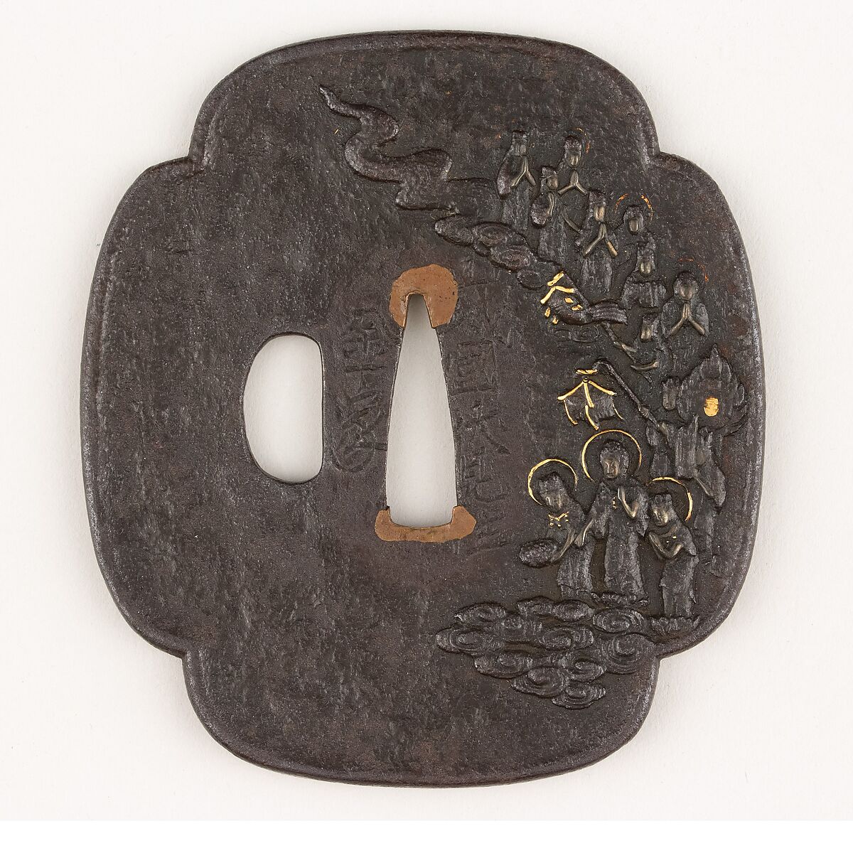 A tsuba is a sword guard and part of a sword mounting. It is mounted between the sword’s blade and grip to protect the user’s hands.