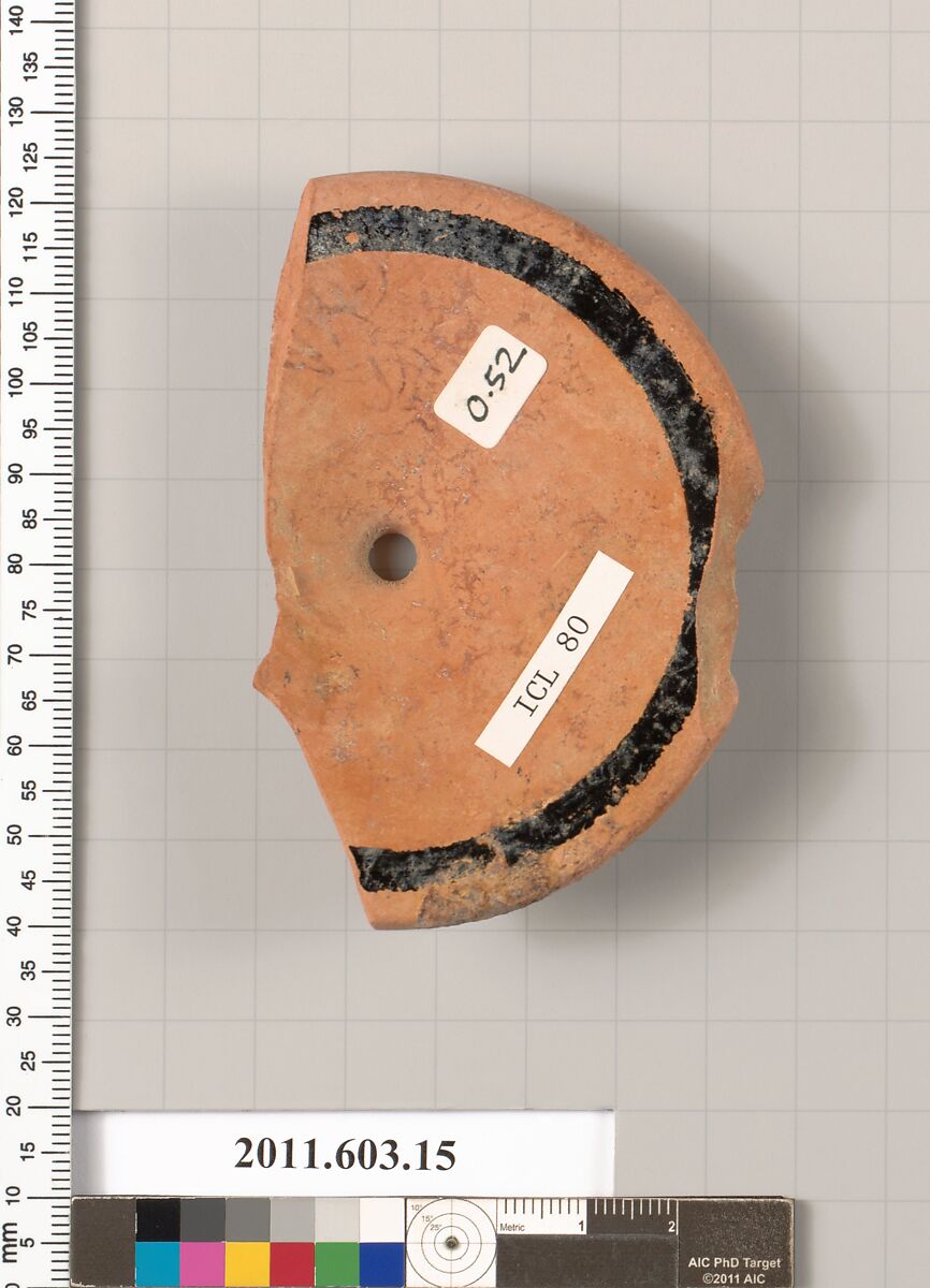 Part of the foot of a kylix, with a chamfer; the outer edge is reserved; the underside is reserved, with a band of black glaze towards the outer edge.