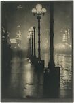 Coburn was mesmerized by the electrified arc lamps of Midtown Manhattan. "It is only at twilight," he wrote in 1911, "that the city reveals itself to me in the fulness [sic] of its beauty, when the arc lights on the Avenue click into being. Many an evening I have watched them and studied carefully just which ones appeared first and why. They begin somewhere about Twenty-sixth street, where it is darkest, and then gradually the great white globes glow one by one, up past the Waldorf and the new Library, like the stringing of pearls, until they burst out into a diamond pendant at the group of hotels at Fifty-ninth street. Probably there is a man at a switchboard somewhere, but the effect is like destiny, and regularly each night, like the stars, we have this lighting up of the Avenue."