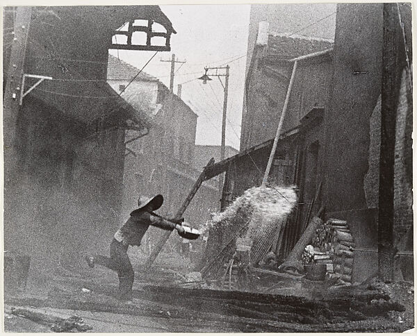 - Title: After incendiary bombardments, a woman tries futilely to extinguish the fire. Hankow