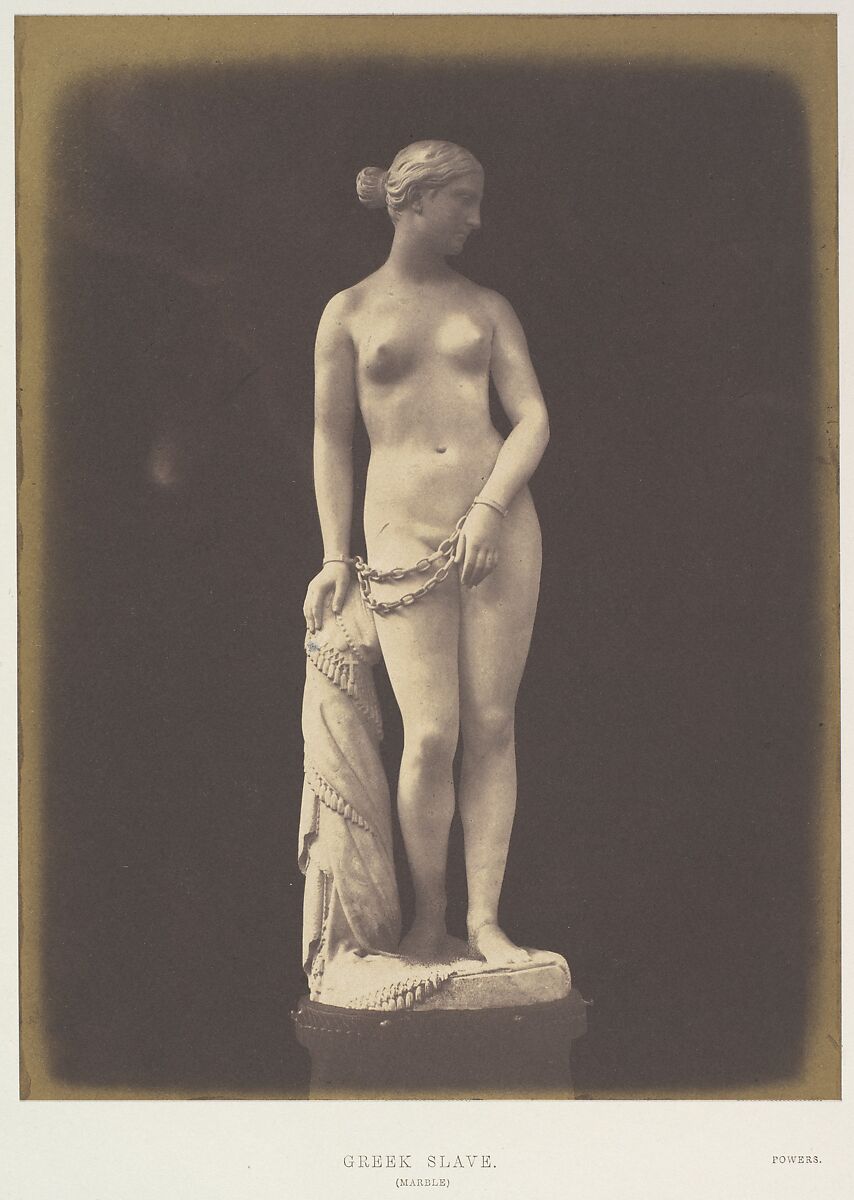 Photography became a primary means of representing sculpture in the mid-nineteenth century, and one of the most photographed works was Hiram Powers' Greek Slave. The American sculptor created six full-size marble versions of a young nude Greek woman in a Turkish slave market, exhibiting them publicly in Europe and the United States. Owen’s calotype records the first carving (1841-43; carved 1844; private collection, England) on display in 1851 at the Great Exhibition held in London’s Crystal Palace. Owen was one of several photographers royally commissioned to create 154 photographs for the Reports by the Juries, a four-volume set issued to document objects on display from fine arts to machinery. Owen’s photograph depicts the prize-winning Greek Slave in situ in the United States section at the exhibition, illuminated from the left against a dark background.