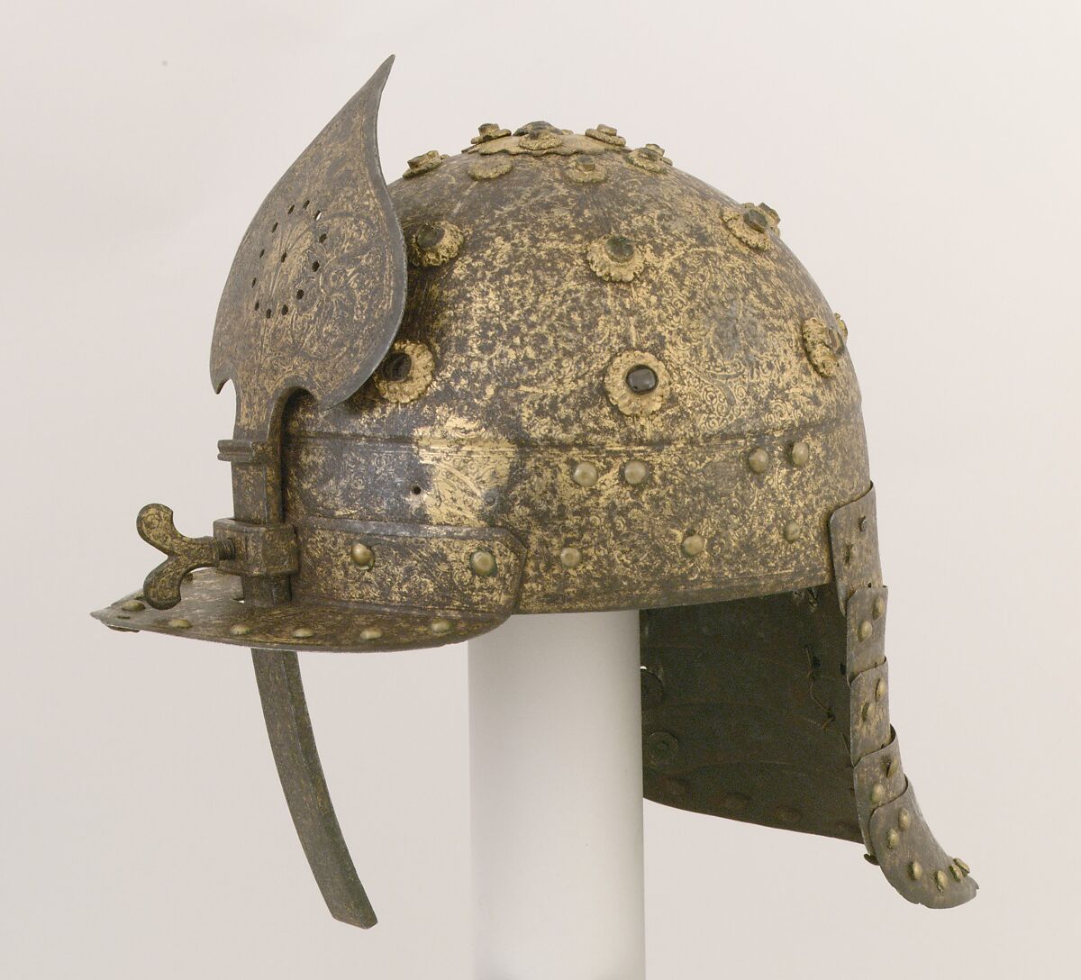 This finely etched, gilt, and jeweled burgonet recalls the sumptuously embellished helmet and cuirass acquired in Augsburg and offered in 1590 by the imperial court in Vienna as tribute to the Ottoman sultan. This helmet once was completed by large shaped cheekpieces in the Turkish fashion.