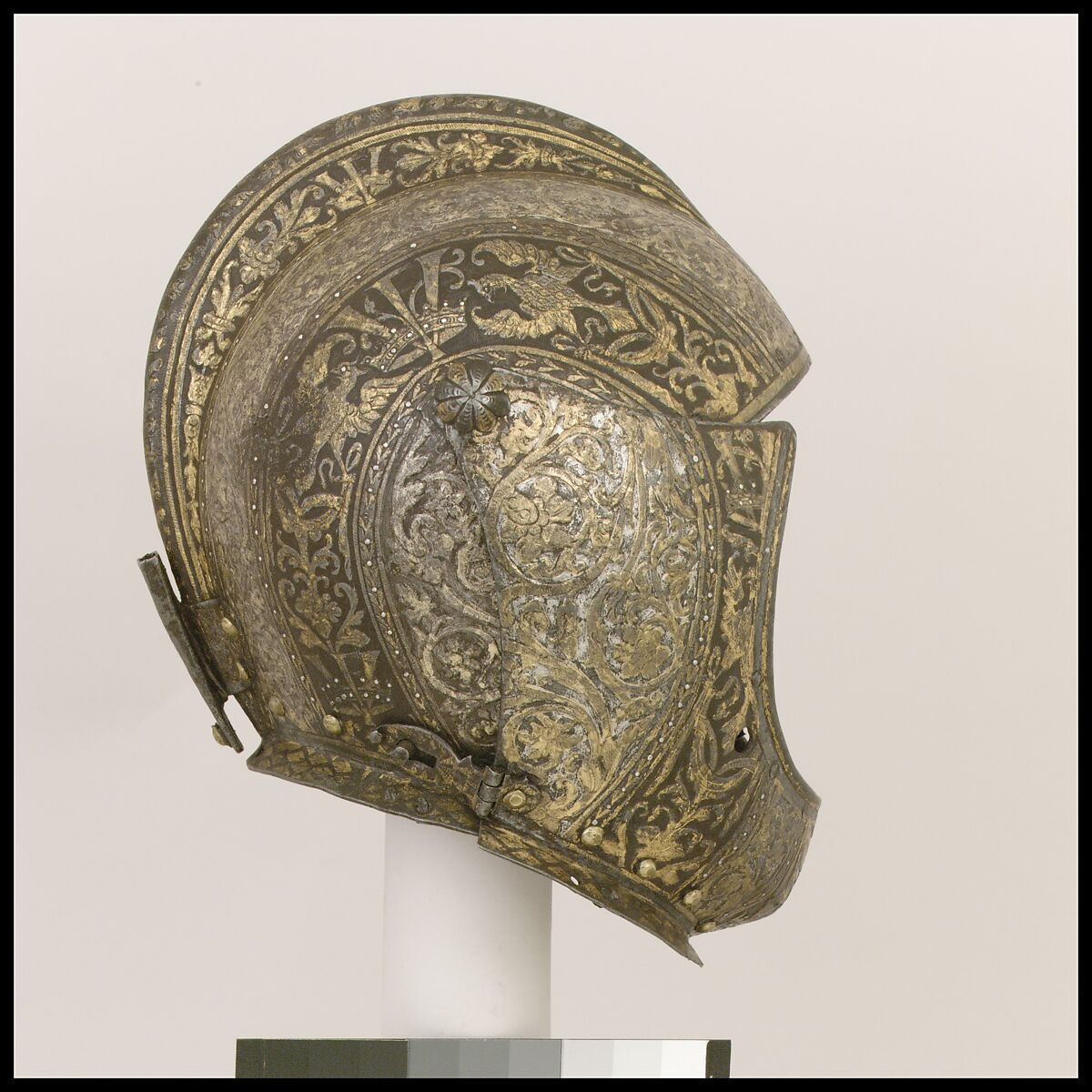 Although incomplete––the face defense and collar lames are missing––this helmet is nevertheless an outstanding example of late-sixteenth-century Milanese armor. Its rich decoration, which is chiseled, punched, and damascened in gold and silver, includes eagles, crowns, and a monogram comprising the letters V and F (or VFL). An armor with identical decoration appears in a portrait of Vincenzo I Gonzaga (1562–1612), duke of Mantua (Palazzo Ducale, Mantua), thought to have been painted about 1587, the year of his accession. Other portions of this armor, which appears to have been a large garniture intended for field, mounted tournament, and foot combat at the barriers, are preserved in the Musée de l'Armée, Paris, and the Armeria Reale, Turin.