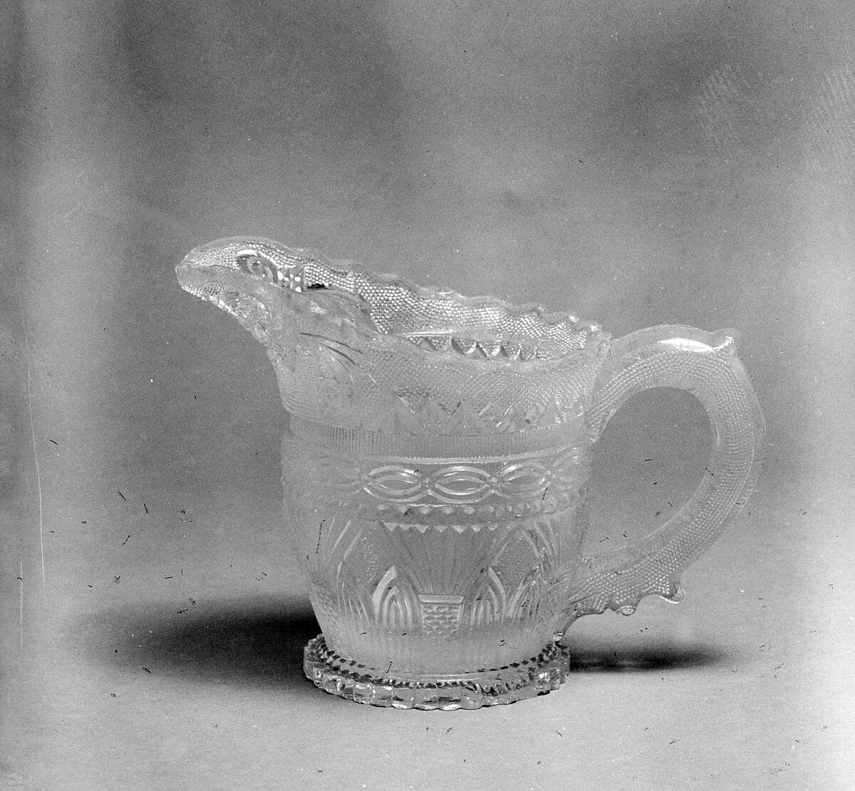 The gothic arch pattern is pressed below the guilloche band on the body of this pitcher. The pitcher was pressed in the same mold as two others, 51.171.96 and 51.171.19.