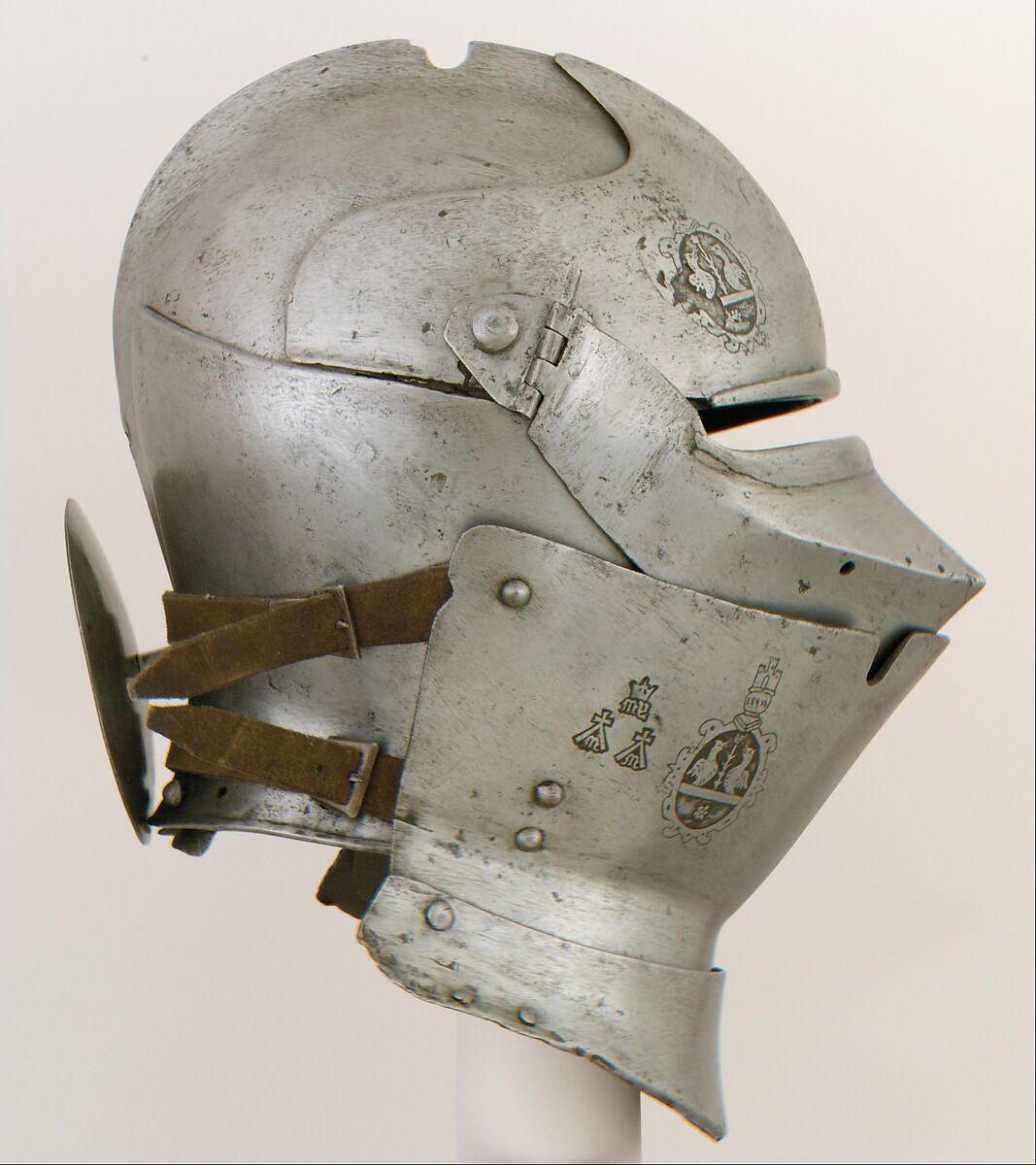 The Museum's armet and wrapper are contemporary but associated. The bowl is struck on either side of the medial ridge at the back with a Brescian-style armorer's mark consisting of the letters IA (?) beneath the abbreviation sign. The wrapper bears the marks of the famous Missaglia family of Milan used before 1452: the letters MY beneath a crown and below, struck twice, an M beneath a split-legged cross. Both pieces were etched at a later date with arms said to be those of the Piombini family. (The visor is associated and the rondel is modern; the wrapper has been altered.)