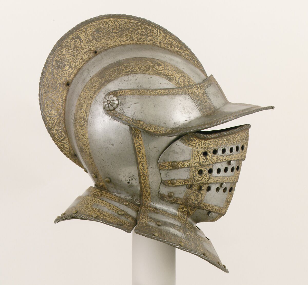 On cavalry helmets of this type, the face defense, called a falling buffe, can be lowered in three sections for better visibility and ventilation. This example has distinctive etched and gilded decoration featuring scrolling vines ending in dragon heads and cornucopias.
