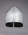 This sallet is one of the few surviving examples in the Franco-Burgundian fashion. Although constructed in the contemporary Italian manner, with separate brow and tail plates, the pointed bowl is characteristic of sallets illustrated in French and Burgundian manuscripts and tapestries and of several surviving examples preserved in English churches. The generally similar sallet preserved at Coventry Cathedral bears Milanese-style marks thought to be those of an Italian armorer working in Bruges who is also recorded as having an English clientele. Reportedly found in a river in France (the Somme and Meuse are both cited as its source), this sallet was deeply corroded and has been extensively repaired.