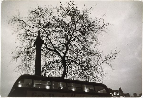 Although Frank's reputation was secured with The Americans-the 1958 publication of his Beat-inflected American series (1955-57)-he developed his eye and methods in Peru, Paris, London, and Wales between 1946 and 1953. In this winter street scene, Frank composes a modernist assemblage with a double-decker bus and its passengers, Lord Nelson's Column, and a leafless tree crowned by roosting birds. Like much of the conceptual art and Beat poetry of the next twenty years, the information is provisional and the effect unsettling. The London pictures have never been published as a suite and thus have yet to be recognized as one of the artist's best and most evocative series.