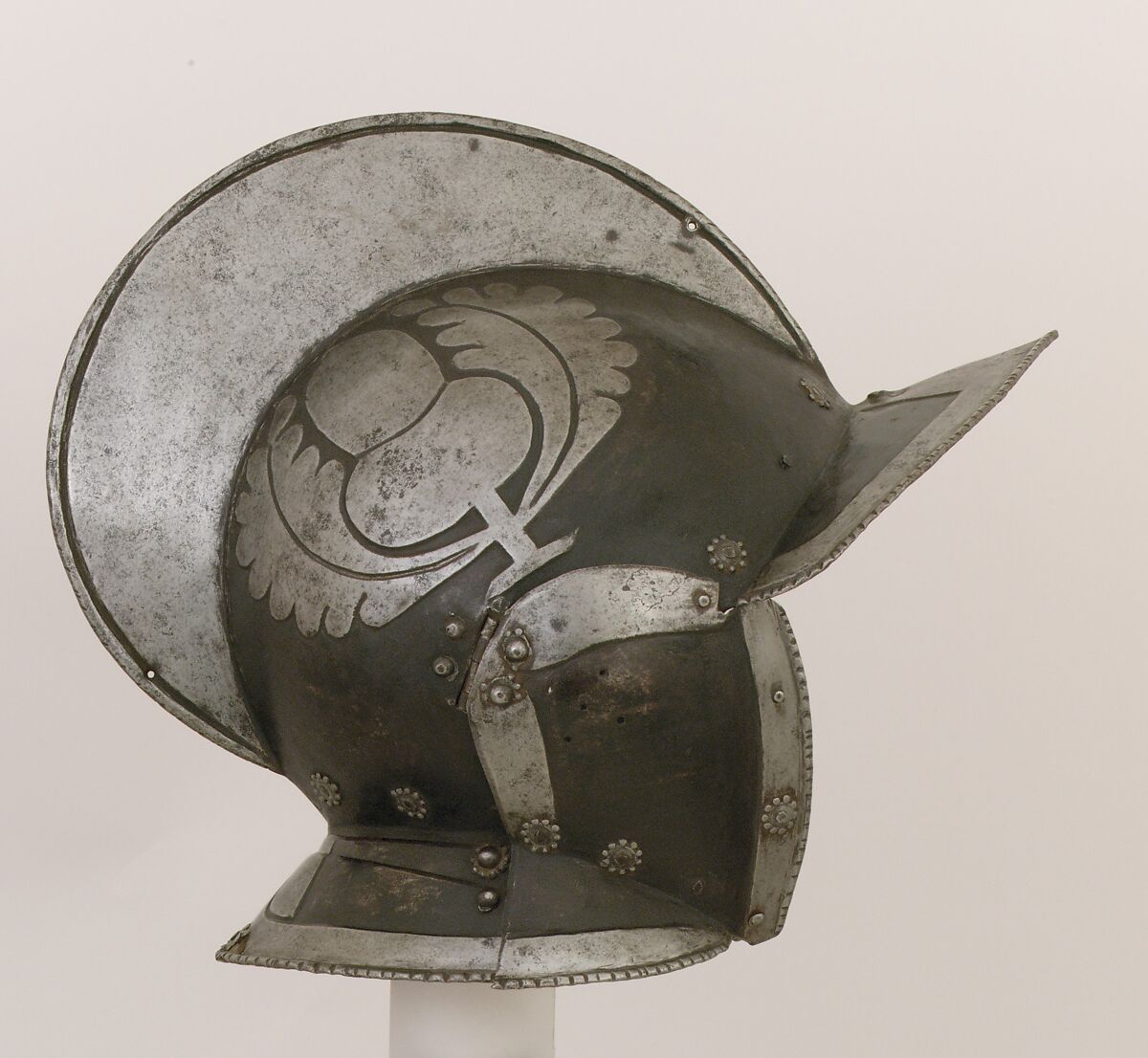 The acorn and oak leaves embossed on the sides of the bowl are emblems of the noble Austrian family Khevenhüller zu Aichelberg (Aichel is German for "acorn"). A series of "black-and-white" armors mounted with similarly decorated burgonets or morions is preserved in the family's castle of Hochosterwitz, near Klagenfürt, in the Austrian state of Carinthia.