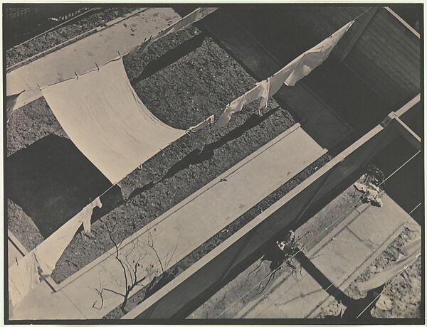 Strand’s small yard on West Eighty-Third Street was nothing much: a fenced-in plot with a few trees. When he first photographed it in 1913, he had shown it in springtime, softening his focus on trees in full flower. Four years later, the yard’s simple configuration of dirt, fence, and flora was consistent as ever. But Strand’s eye had evolved. Awakened to Cubist paintings and Japanese prints, he apprehended the familiar space as a field of light, shadow, and sublime geometry. His earlier picture was cloying, with only an errant streak of empty clothesline anticipating the composition to come. Returning in 1917, he observes from above, finding instead a bright white sheet expectant with possibilities.