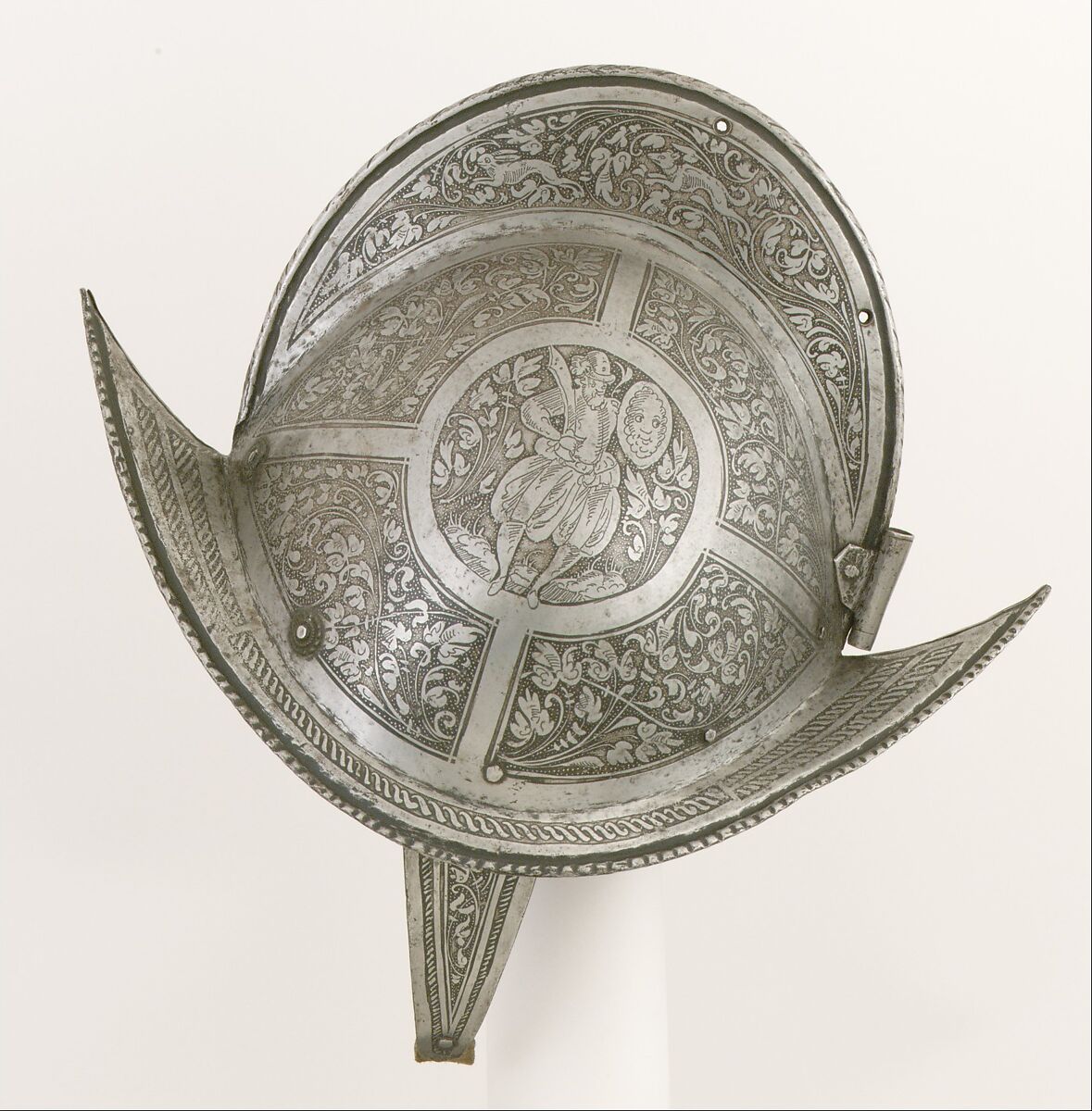 This helmet is one of a series of etched morions that apparently were worn by the guard of the dukes of Hesse; the Metropolitan has one other example (acc. no. 29.158.49) and there are a dozen preserved in the Hessisches Landesmuseum, Darmstadt. Judging from the similarity in form, the use of the same rosette-shaped lead washers beneath the lining rivets on the exterior, and the pattern and style of etched decoration, the Darmstadt series was fabricated in the same center as another helmet in the Metropolitan Museum's collection, acc. no. 28.195.1.