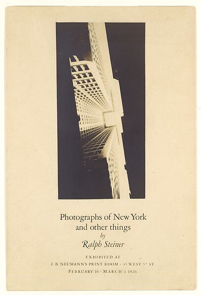 When Steiner took this remarkable upward view of a skyscraper and its airshaft, his radical vantage point was a novelty in America. (The abstraction and torque of the image were more characteristic of European constructivist artists, in particular László Moholy-Nagy and Alexander Rodchenko.) The print served as a postcard announcement of Steiner's first exhibition, which took place at J.B. Neumann's Fifty-seventh Street gallery in 1926.