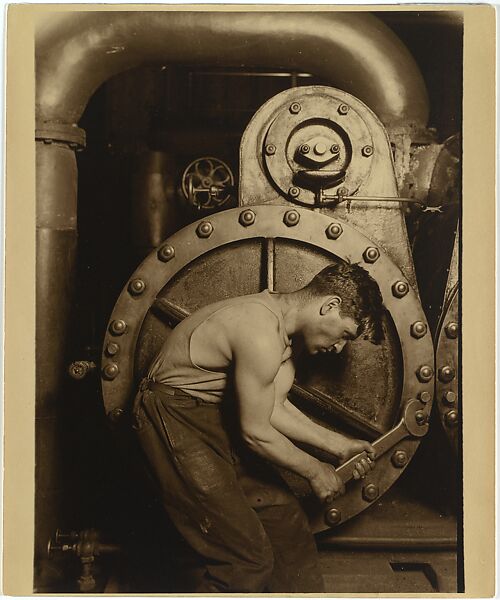 Hine’s iconic photograph of a mechanic in a Pennsylvania power plant celebrates the worker as a noble contributor to industry. The picture’s perfect union of mechanic and machine equates human muscle with industrial strength. Hine carefully positioned the man within the curves of the steam line and cylinder head. Striking a coiled pose for the camera, the worker grips his wrench, but close inspection reveals that it does not connect fully to the nut.
