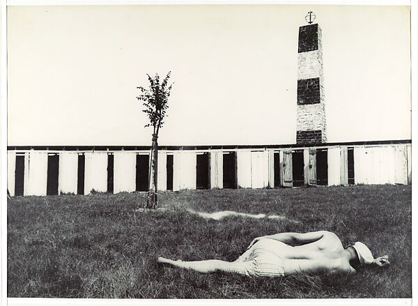 In this early work, made just two years after he acquired his first 35mm Leica camera, Cartier-Bresson captures a scene of formal poetry and evocative mystery on a beach in Trieste, Italy, the site of one of his many travels in those years. Punctuated by the upright verticals of a tree and a brick tower, the horizontal expanses of sky and lawn are mirrored in the languorous pose of the outstretched figure. Suggesting calm and repose, the scene and the figure’s averted face nevertheless contain a disquieting note. Cartier-Bresson would continue to explore such themes throughout his long career, finding the surreal and the discordant within seemingly ordinary moments.