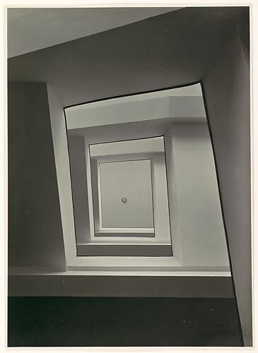 In this deceptively simple photograph of a new block of international style apartments, Mantz evoked the presence of adjacent "hygienic" balconies open to light and air. By waiting for their shadows to fall obliquely across the stepped arrangement of windows, he also suggested, as if by X ray, the stair linking the florrs behind the blank facade.
