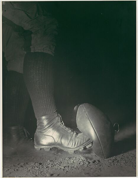 In 1931 at the Massachusetts Institute of Technology, Dr. Edgerton invented an electronic lamp that made stroboscopic photographs like this possible. Edgerton commented in his book Flash!: "...the kicker is Wesley E. Fesler, onetime all-American star at Ohio State, and the ball is inflated to the normal playing pressure of approximately 13 pounds to the square inch. Measurements show that the boot penetrates at least half the diameter of the ball. At the top of the ball, note the dust suspended in mid-air as the rapidly accelerated ball leaves."