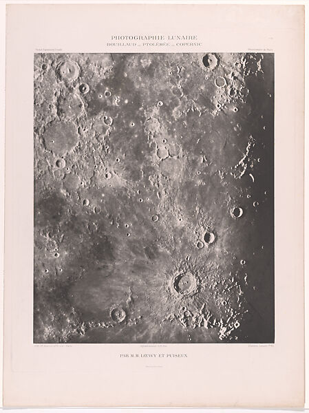 This enormous photogravure was made for the multivolume lunar atlas by Maurice Loewy and Pierre Henri Puiseux, L'atlas photographique de la lune (1910). The negatives were produced at the Paris Observatory with a camera attached to a telescope. Since the earth and the moon are moving constantly, the camera and telescope had to move accordingly to produce a clear image-no easy feat considering the long exposure times required to take photographs at night. Both were synchronized with the moon's path by a sophisticated preset clock system, and the resulting images, such as this example, maintained an impressive amount of detail, even after subsequent photographic enlargement and transfer to an etching plate. By the end of the nineteenth century, when the Atlas project was initiated, photogravure had improved sufficiently to allow thousands of ink prints to be produced from a single plate, which led to the wide circulation of photographically illustrated texts-and, in this case, the sharing of astronomical research. The three names in the title refer to lunar craters visible in the image.