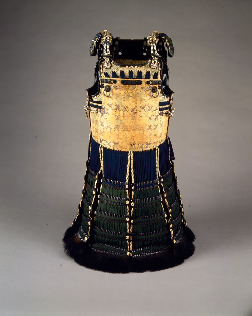 The breastplate and backplate of this remarkably well preserved dō are made of large iron plates, rather than the kozane (small overlapping scales) frequently found on Japanese armor. The interior, an area usually covered only with lacquer or plain leather, also has stenciled doeskin, an indication of its high quality. The fittings are made of shakudō, an alloy of copper and gold in which the finished surface is patinated a bluish black. They are finely chiseled with Paulownia blossoms and arabesques and are among the best examples of this type of metalwork. The kusazuri (skirt) consists of eight sections, the bottom edge of each being lushly trimmed with bear fur. The colorful odoshi (silk lacing) is equally an integral part of the armor's construction and its decoration. Very few armors of this form, quality, and condition have survived in Japan or anywhere else.