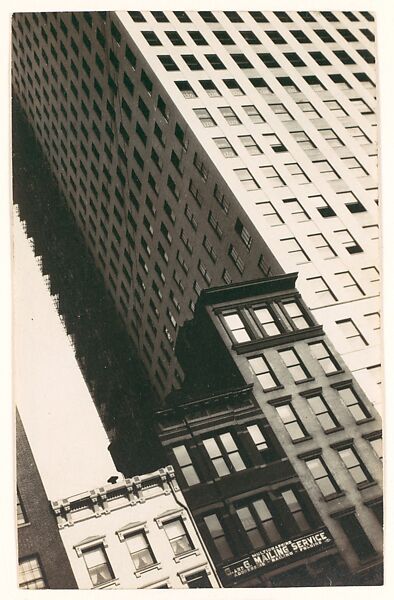 After living in Paris for a year, Evans moved to New York in 1927 and soon began photographing the city’s architecture, signage, and street life. Like his peer, Berenice Abbott, he used a small-format camera to make abstracted views of the city in an angular style heavily influenced by European modernism. Because Evans had no darkroom of his own during this period, Abbott let him use the darkroom in her studio at the Hotel des Artistes on the Upper West Side, where he may have made this print.