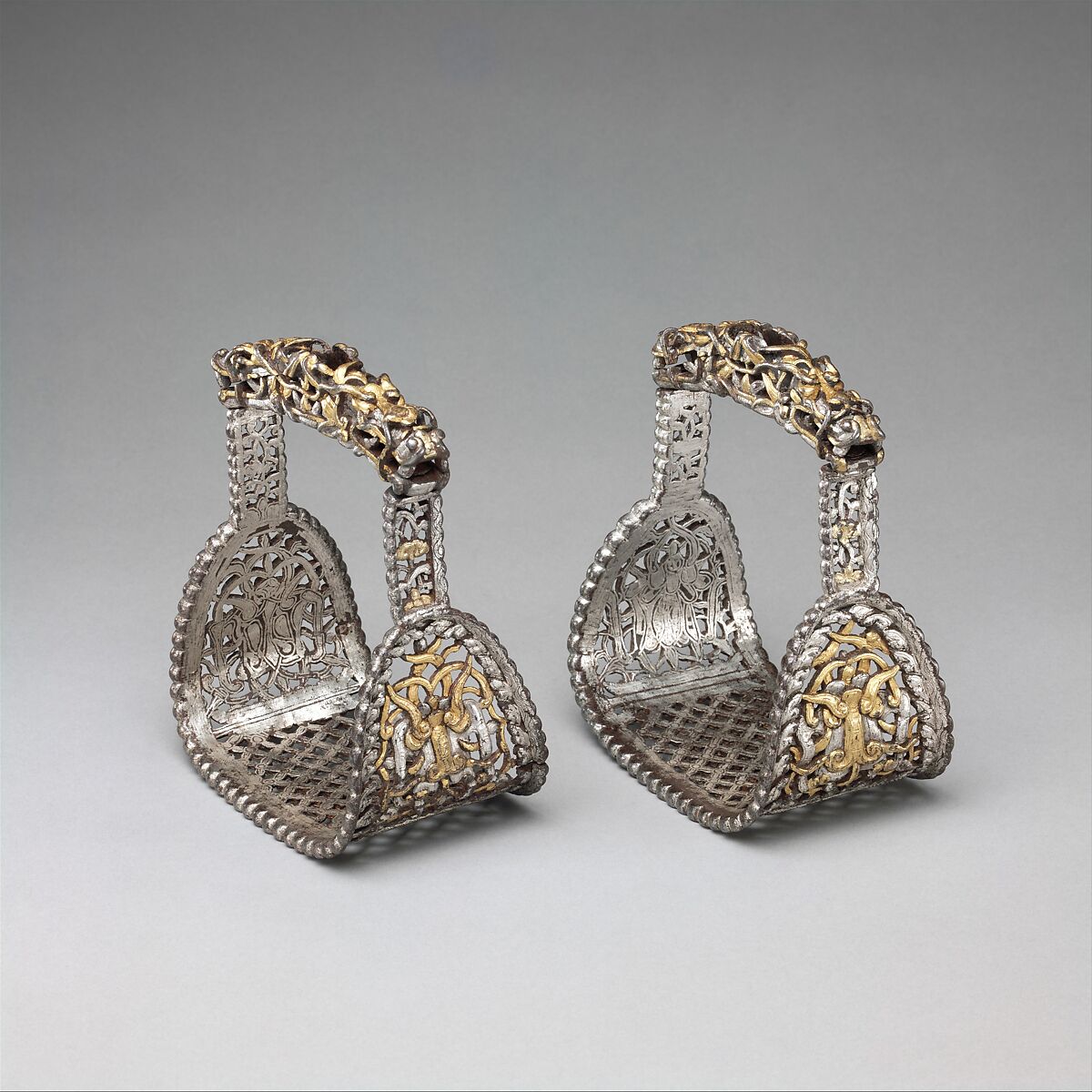 This pair of stirrups is without equal in style, form, and construction. In particular, the combination of high relief, pierced work, and deep chiseling of the iron, highlighted by the lavish use of gold and silver, is unmatched on any other known pair of stirrups from Tibet, China, or Mongolia.