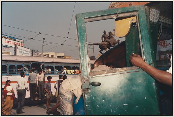 Born into an aristocratic family in Jaipur, India, Singh lived and worked in Paris, London, and New York, but his lifelong subject as a photographer was the vibrant culture and landscape of modern India. With its emphasis on visual surprise and spontaneity, Singh's work belongs to the tradition of small-format street photography pioneered by such artists as Henri Cartier-Bresson and Robert Frank. Unlike many of his European counterparts, Singh worked exclusively in color, often composing his images with a graphic complexity akin to that of Mughal miniatures. This photograph, with its motley collection of urban details thrust into perfect balance by the camera, is typical of Singh's breathtaking visual dexterity.