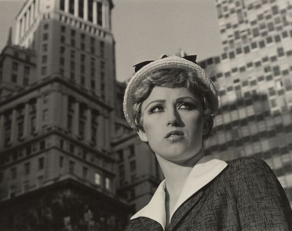 Between 1977 and 1980 Sherman photographed herself in a series of sixty-seven scenarios staged to suggest the cinematic tropes of midcentury Hollywood. Here, she assumes the guise of the Hitchcockian "career girl" alone on the streets of the big city. Sherman accentuates the dramatic artifice of her pictures, emphasizing those elements of production that often go unnoticed: camera angles, lighting, costumes, and backgrounds all come to the fore, triggering the stock narratives and characters from which our own identities are composed.