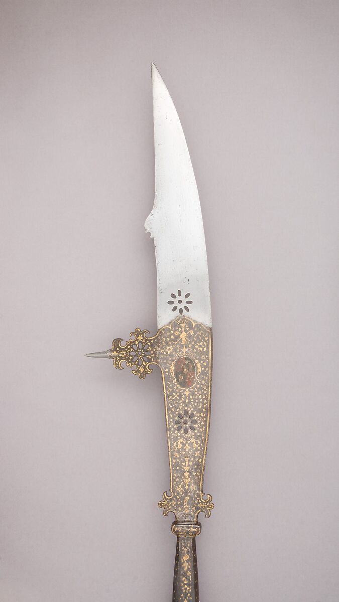 Two rosettes pierce the long knife-like blade which has a spike set on a decoratively cut and pierced base at right angles to the back; between the blade and its socket are two trefoil-shaped lugs. The lower half of the blade, including the spike, is blued, chiseled, and damascened in gold; the decoration on each side includes flowers, grotesques, a sun, and a trophy composed of two conucopias and a flaming torch. An oval medallion on the right side is painted with the arms of the counts of Tiepolo, and that on the left side contains the arms of the counts of Valmarana, both ancient Venetian families. Above the arms of Valmarana is a helmet crested with a palm tree and scroll inscribed MODVS. The octagonal wooden shaft is covered with red velvet (now rubbed) and is studded with gilt iron nails.