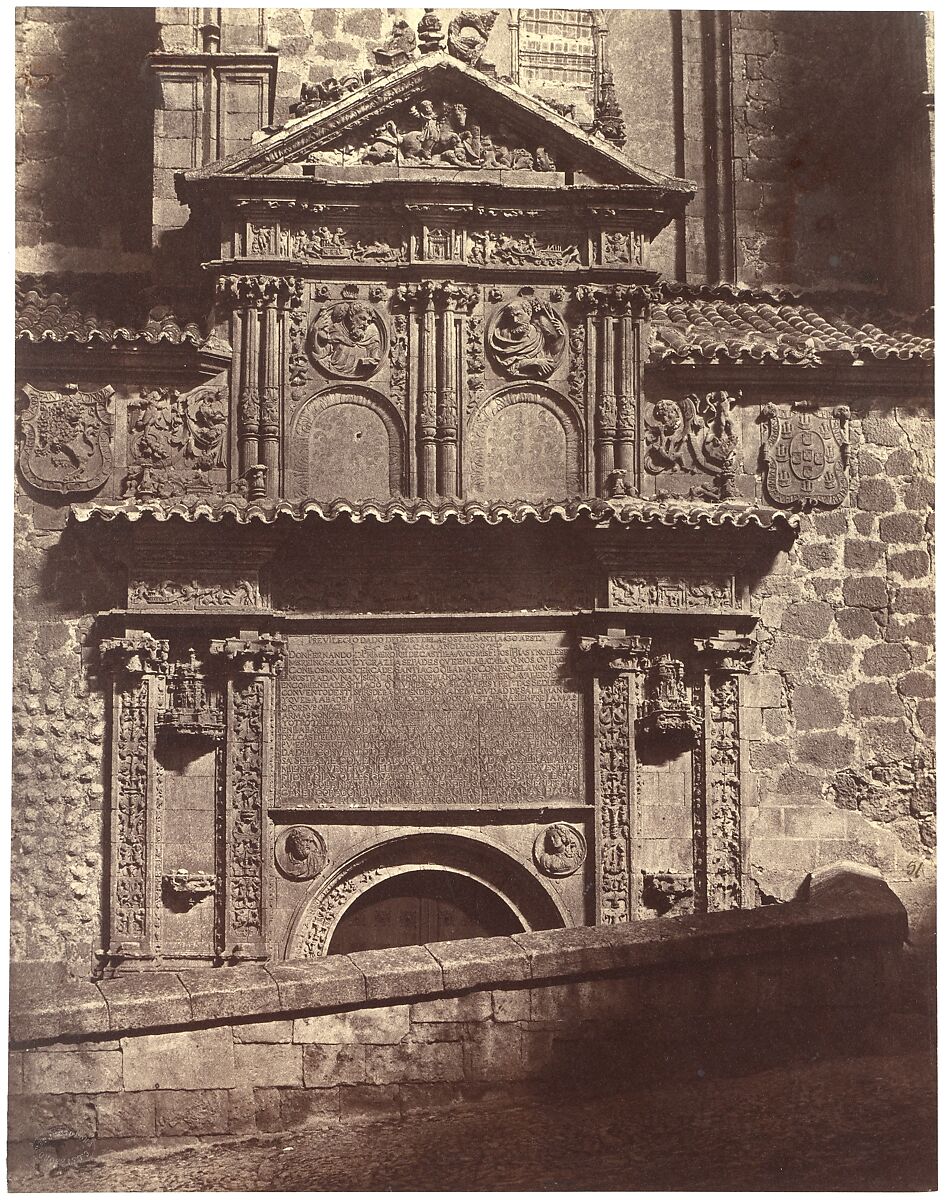 In his search for subjects of historic interest, Charles Clifford traveled throughout Spain. Here, constrained by the ancient streets of Salamanca and forced to create a composition devoid of depth, he nevertheless managed to choose the moment when the early morning sun picked out the detail of this elaborately carved doorway by the eminent sculptor Berruguete.