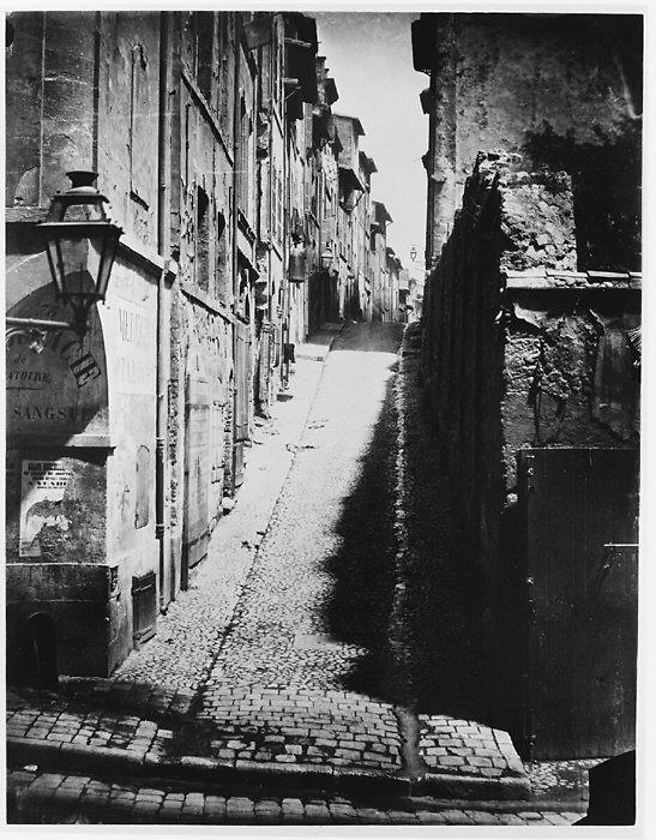 From 1862 to 1881 Adolphe Terris photographed the massive changes in Marseille's urban fabric for the municipal and prefectural governments-a project comparable in scope and intention to Charles Marville's commissioned views of Paris during the same period. His first series (from which this picture is taken) was produced to preserve the memory and appearance of the old quarters of Marseilles before they disappeared forever. In this view, Terris leads the eye up a hilly street drenched in midday sun towards a street lamp jutting out from a building at the peak of the road, as if signaling the way toward the town's impending modernity.
