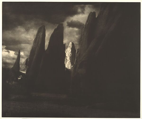 In the years between his first and second trips to Paris (1902–7) Steichen established his reputation not only as a portraitist but also as an artist who could tackle in photography the traditional subjects of painting and rival the older medium in scale, color, and expressiveness. His image of the Flatiron Building, The Pond—Moonlight, The Big White Cloud, Lake George, and Chestnut Blossoms all date from this period. Storm in the Garden of the Gods is among his most dramatic and expressive images, conveying the power of the landscape that he described in a letter to Stieglitz: "I managed to see a lot of Nebraska, Colorado, & New Mexico, and in a way feel it is one of the greatest things I have experienced—not so much from a pictorial standpoint [as from] the bigger standpoint of life. . . . Somehow since I have been west I almost regret going to Paris—or Europe."