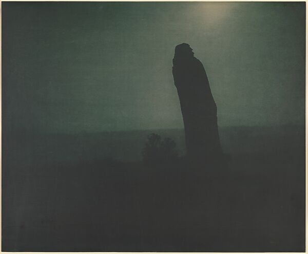 Late in the summer of 1908 Rodin moved the plaster of his sculpture of the French writer Honoré de Balzac out of his studio and into the open air so that Steichen, who disliked its chalky aspect in the daylight, could photograph it by the light of the moon. Waiting through several exposures as long as an hour each, Steichen made this exposure at 4:00 A.M., when the moonlight transformed the plaster into a monumental silhouette against the brooding nocturnal landscape. Steichen recalled that when he presented his finished pigment prints some weeks later, an elated Rodin exclaimed, "You will make the world understand my Balzac through your pictures. They are like Christ walking on the desert." Stieglitz reproduced this image along with nine of Rodin's drawings in "Camera Work" in July 1911.