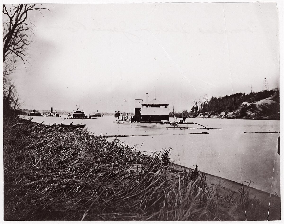 Ironclad fleet on James River below Rebel "Howlett House Battery"