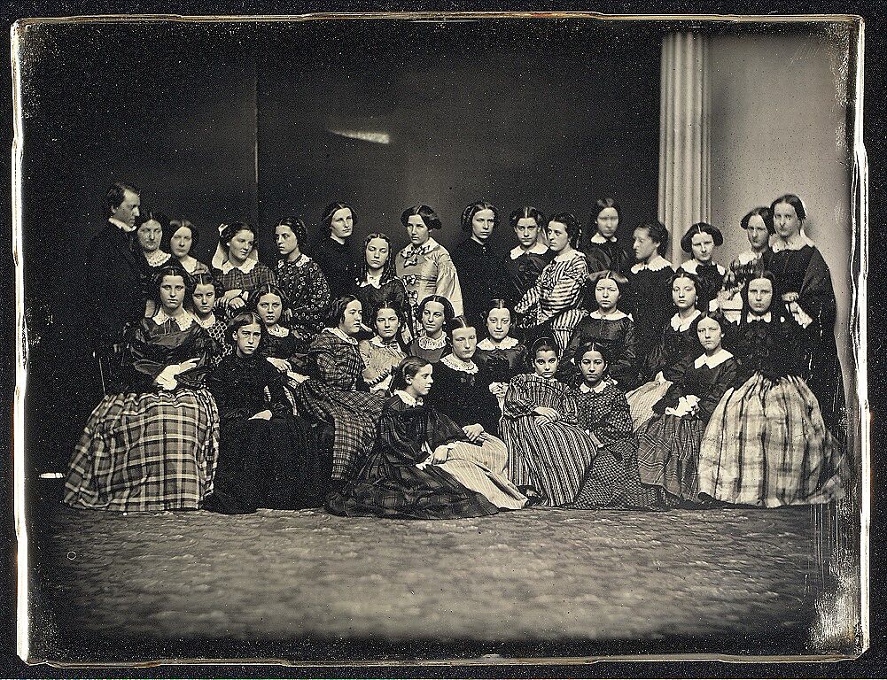 The Boston partnership of Southworth and Hawes produced the finest portrait daguerreotypes in America for a clientele that included leading political, intellectual, and artistic figures. This full-plate daguerreotype shows the students of the most prominent school for young women in Boston, established in 1823 by George Barrell Emerson, second cousin of the poet and philosopher Ralph Waldo Emerson. Although there are over thirty figures in this portrait, the subtle variations in posture, gesture, and facial expression-especially among the seated students in the center-create the impression of a group made up of vivid and distinct individuals.