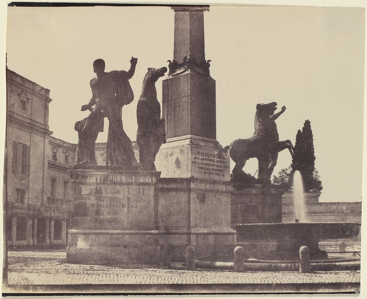 The colossal statues of the "horse tamers" Castor and Pollux have graced Rome's Quirinal hill since antiquity. The Egyptian obelisk that now sits between them was moved to the site in the 1780s, shortly after having been discovered at the mausoleum of Augustus. The author of this anonymous calotype saw the possibility of expressing the energy of the famed sculptures in dramatic and animated silhouette.