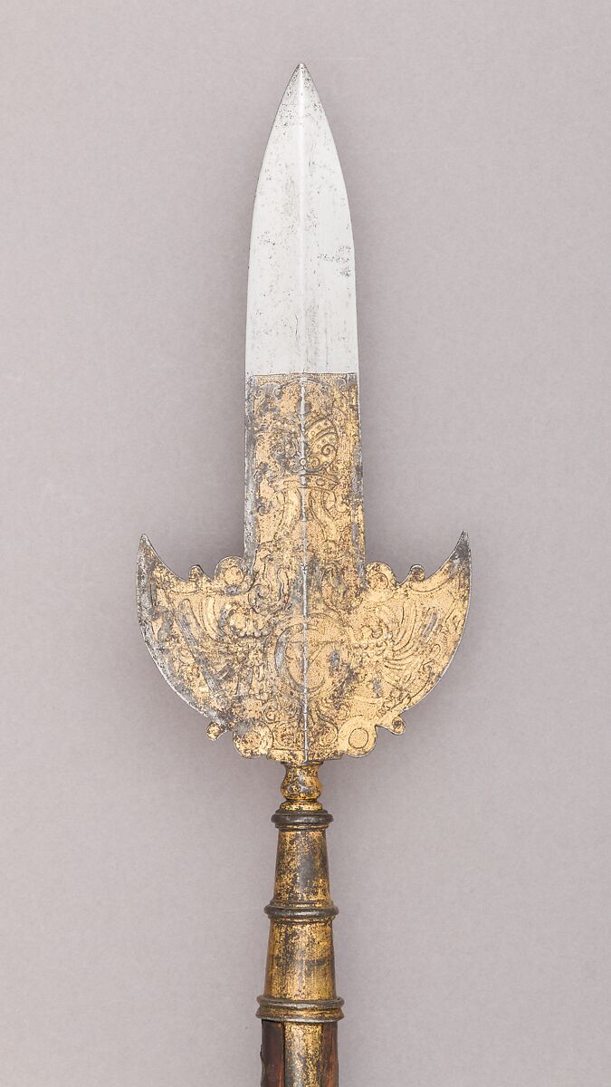 The wide, double-edged blade of flattened diamond section is flanked at its base by two cusped lugs with up-turned points. Turned moldings join the head to the socket, the latter with three ring moldings and side straps. The lower half of the blade and the socket are gilt, the blade etched with the following motifs: on one side is a double-headed eagle under an imperial crown, and on its breast an oval medallion bearing the monogram C VI (Carolus VI); on the other side are trophies of arms and two bound captives. The original shaft of wood is inlaid near the top with two brass letters on either side of the straps: Ö and Ẏ.