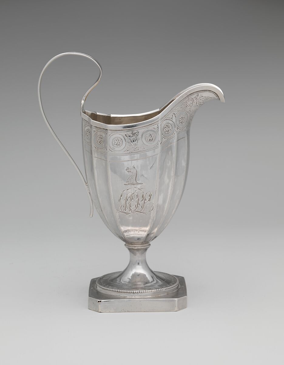 This handsome tea and coffee service (1980.503.1--.4), although unmarked, has been attributed to the Philadelphia silversmith Christian Wiltberger on the basis of style. Stately and dignified, with its fluted forms and generous proportions, it represents the fully matured Neoclassical style. The service belonged to Eleanor Parke (Nelly) Custis (1779–1852), granddaughter of Martha Washington, who married George Washington's nephew Lawrence Lewis (1767–1839) on February 22, 1799. Family tradition holds that the service was a gift from General Lafayette and his son, who were close friends of the family. In addition to the matching bands of bright-cut ornament, each piece is engraved with the Lewis crest and with the script monogram "LEPL" for Lawrence and Eleanor Parke Lewis. In place of the customary urn or flame-shaped finial, cast eagles surmount three of the pieces, especially appropriate for America's first family.