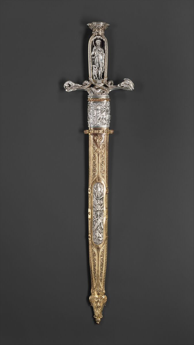 This hunting sword is a masterpiece of the Gothic Revival style and a virtuoso demonstration of mid-nineteenth-century design and craftsmanship, which were greatly stimulated by the series of international exhibitions held in London and Paris in the 1840s–60s. It is virtually identical to one executed by an otherwise unrecorded craftsman, Marcet, for the Paris firm of silversmiths and jewelers Marrel Frères, which was shown at the Great Exhibition held at the Crystal Palace, London, in 1851. That sword was especially praised by the exhibition's jurors, who noted that its design "left nothing to be desired." As a measure of their success, Marrel Frères received a medal for their display, and no fewer than five of their objects were purchased by the English commissioners for the new Museum of Practical Art, the forerunner of the Victoria and Albert Museum. The hunting sword was among these, valued at the substantial sum of £200, and is now in the Victoria and Albert Museum (reg. No. 159-1851).