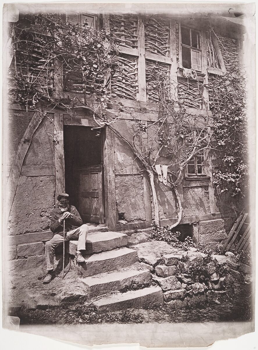 - Title:[Man Sitting on Steps of House with Socks Hanging on Nearby Vine to Dry]