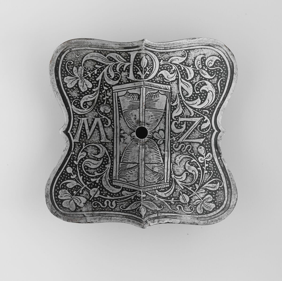 Initially intended to reinforce the shaffron in the vulnerable forehead region, escutcheon plates became increasingly decorative in the sixteenth century, providing a prominent surface for heraldic display, personal emblems, and devices. This example is etched with an hourglass, and the (abbreviated) motto Mit der Zeit ("with time," in the sense of "all in good time")––the device of Ottheinrich (1502–1559), Count Palatine of the Rhine.