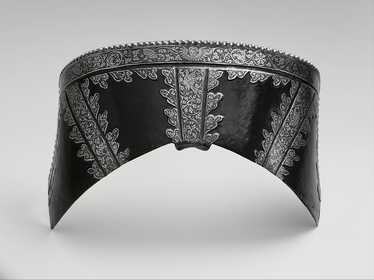 Inventories of the Neuburg Castle armory identify the garniture as having been made in Augsburg in 1563 for Count Palatine Wolfgang. His ownership is further confirmed by the presence of his coat of arms on the escutcheon plate of the Brussels shaffron. The inventories also mention two additional matching saddle steels, one of which is presumably this cantle plate. For other pieces from the Neuburg Castle armory, made for Ottheinrich or his brother Philipp, see accession nubers 14.25.1654, .1655).