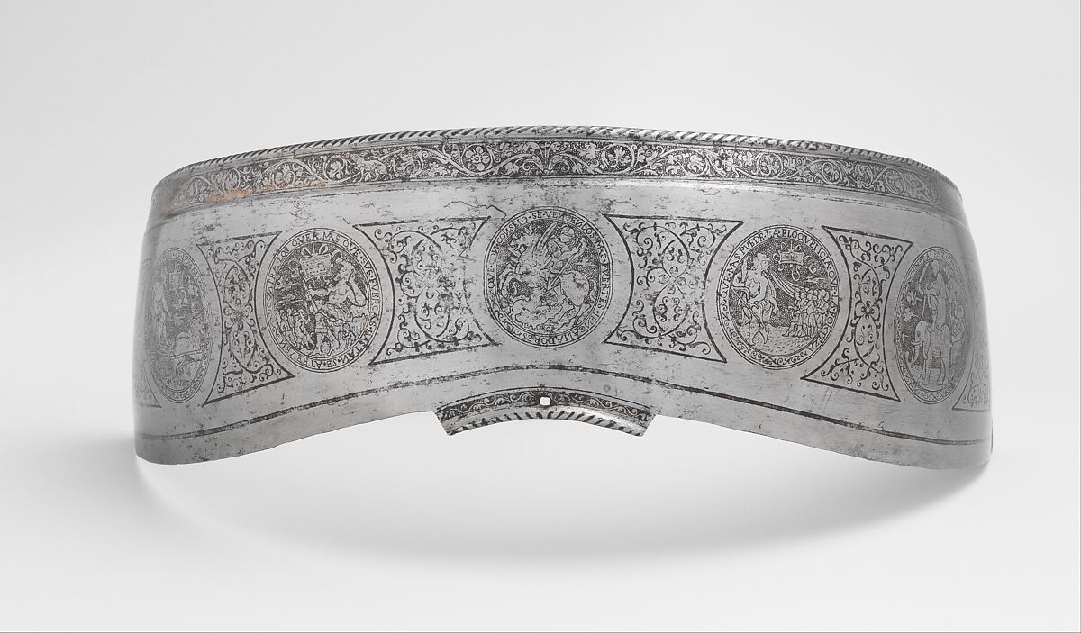 The use of figural scenes within large rondels of this kind was fashionable in Italian armor decoration from about 1510 to about 1530. The dotted background of the leafy border is a style that came into use in the second quarter of the sixteenth century. These factors, coupled with the 1549 publication date of the Spanish edition of Alciato, suggest that the Museum's cantle plate was made around midcentury, possibly for a Spanish nobleman serving in Italy.