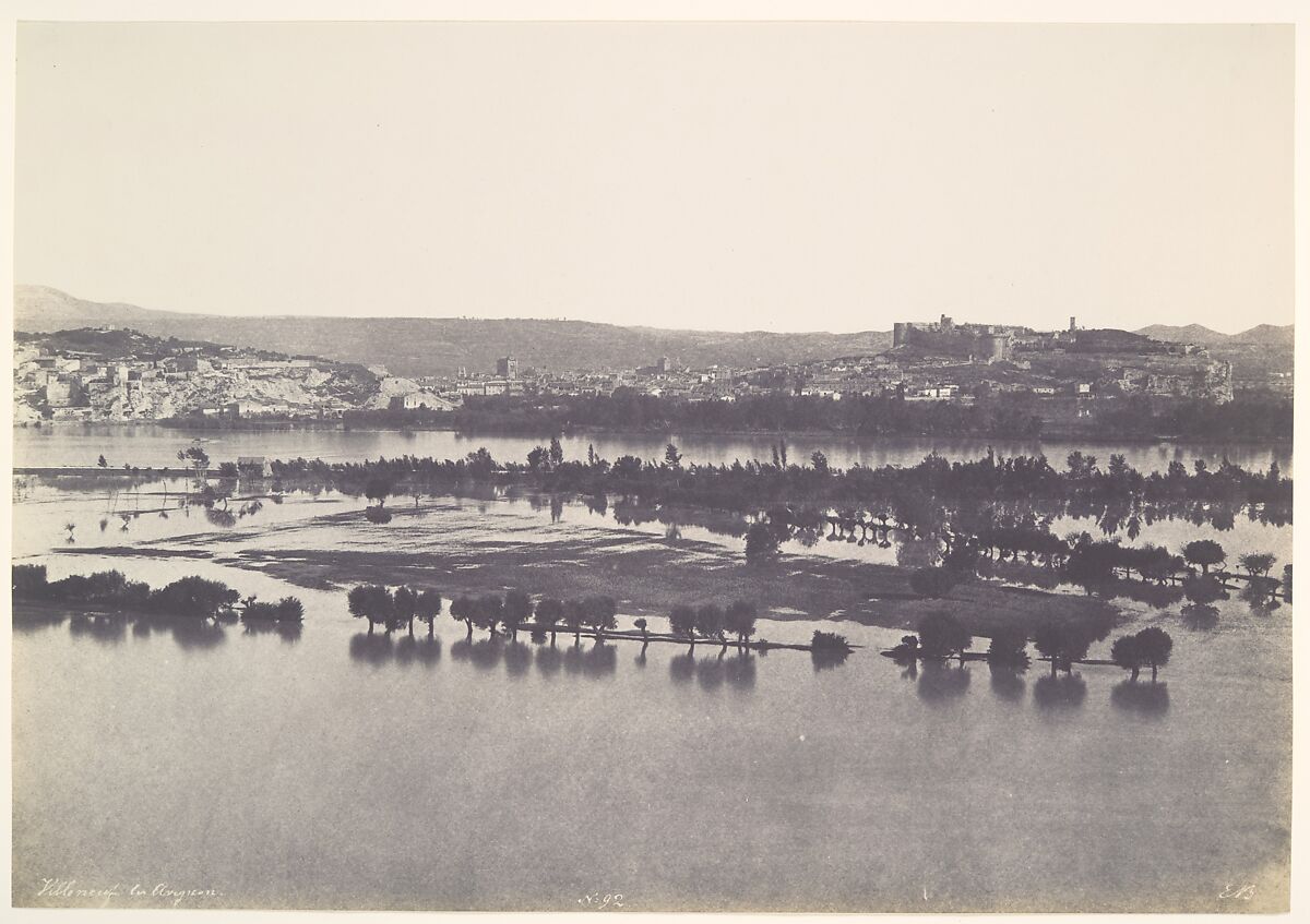 In Avignon, Baldus portrayed the disastrous floods of 1856 with uncommon lyricism. Standing on the cathedral terrace, he pivoted his camera to compose a sweeping six-part panorama that encompasses the entire Rhône valley. In this section, one can see the flooded island of Barthelasse, the town of Villeneuve-lès-Avignon, and the river, slowly returning to the confines of its banks. Mulberry and willow trees dot the watery landscape, showing the contours of previously dry land, and trees, boats, houses, and hills float on the water's surface, as if in the cushioning embrace of pale heather velvet. There is no hint of the violent torrent.