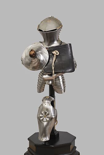 Although unmarked, this shaffron can be attributed to Augsburg manufacture of about 1545 based on the similarity of its etched decoration to that of the "knots" garniture made by Desiderius Helmschmid in 1544 for Philip II of Spain while he was still a prince (Real Armería, Madrid, A. 189–216). The decoration of Philip's armor derives from a design supplied by the Spanish painter Diego de Arroyo and was executed in Augsburg by the etcher Ulrich Holzmann (rec. 1534–62). The principal difference between the decoration of the two shaffrons is that the framing foliate bands on Philip's are gilt while those on the Museum's are blackened.