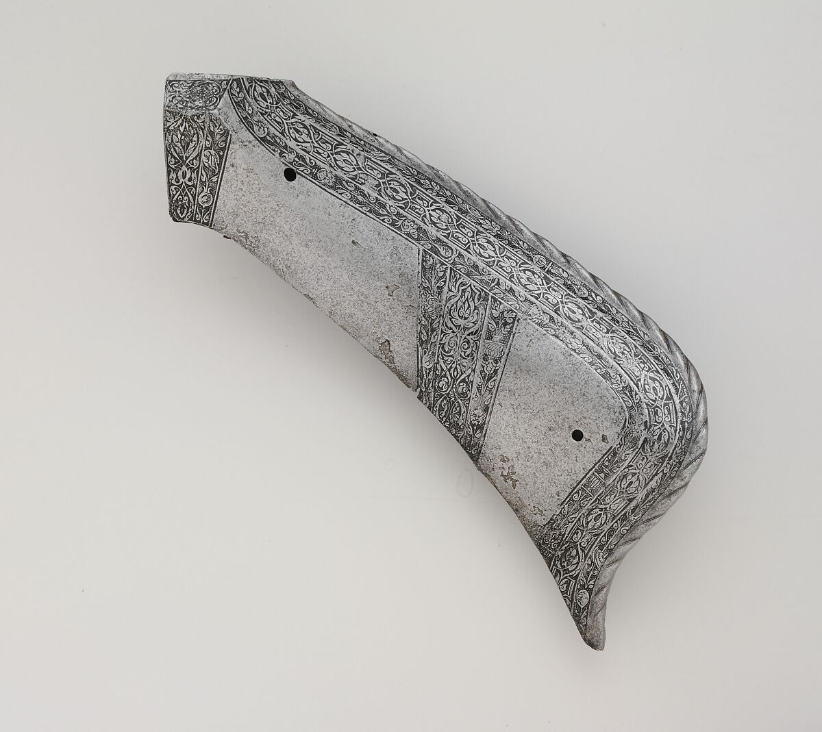 The Metropolitan Museum possesses a small group of elements with this decorative pattern or a slight variation of it, including the present saddle steels, a shaffron (29.158.607), a pair of gauntlets (14.25.901a, b), and three collar plates from a helmet (20.150.2). While the gauntlets and collar plates apparently belong to Philip's garniture, the saddle steels and shaffron, which lack the gilding of the side bands that distinguishes the decoration of Philip's armor, appear either to come from another commission or commissions carried out by the same craftsmen or to be closely modeled after their work. The etching is characterized by groups of three broad, parallel bands, the center one filled with an interlacting, leafy arabesque pattern on a plain, blackened ground, and the sides with subtle foliage on a blackened and dotted ground. The design represents a high point in non-figural ornament on South German armor from the first half of the sixteenth century.