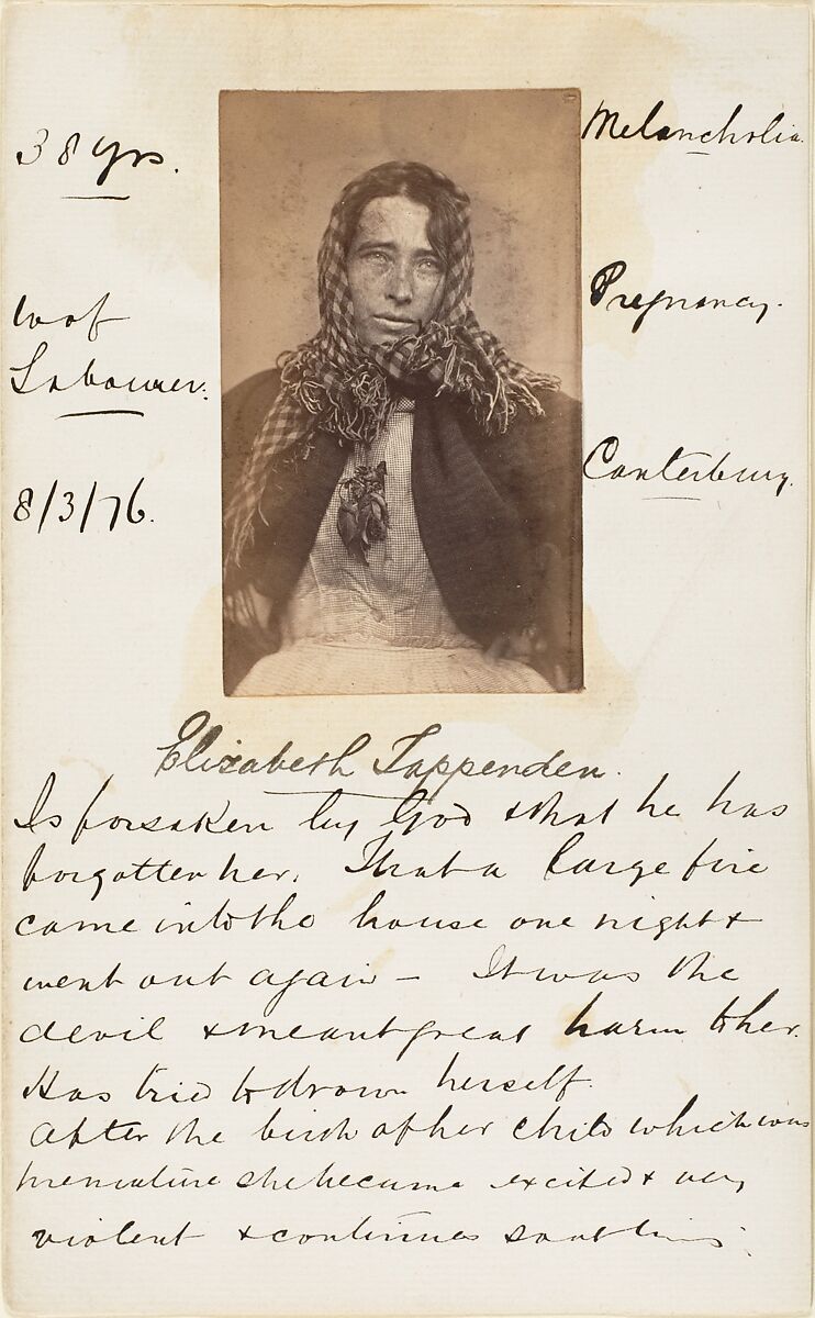 A sobering foil to the cartes-de-visite of the celebrated and powerful, these records from an unidentified British insane asylum exemplify the 19th century’s varied uses of the medium as a means of diagnosis, surveillance, and social control. The photography of mental illness has its roots in the physiognomic research of Johann Kaspar Lavater (1741-1801), who believed that diverse forms of madness could be read in the individual’s physical features. Emblems of Victorian repression, these kinds of pictures actually served multiple purposes: as a record of the patient’s initial condition, for therapeutic use with the patient to show them their progress, and as identification in case of escape. The photographs’ direct, scientific look is belied by the poignant and harrowing doctors’ notes, which tell of patients "forsaken by God". Like Alphonse Bertillon’s contemporary system of criminal identification using similar cards in Paris, the idea of a photographic archive of social "types" has served as a structural and conceptual model for artists such as Walker Evans and Diane Arbus.