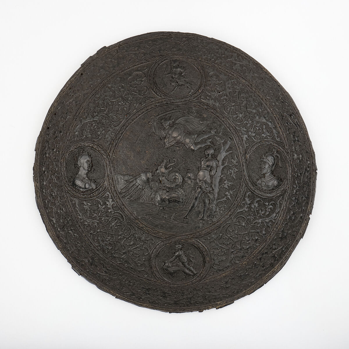 This shiled is formed of a circular base of wood, convex in section, and covered on both sides with black leather embossed in low relief and tooled. The decoration on the front is organized into three fields consisting of two concentric bands enclosing a large circular center, each band framed with a laurel wreath. The center area contains a scene of the hero Perseus rescuing the maiden Andromeda from the dragon (Ovid, Metamorphoses, IV). Above Perseus are the letters S L. The wreath surrounding the center field extends out to the next concentric band in four loops which form medallions depicting a satyr holding a trumpet (above), Hercules and the Nemean lion (below), and two bust-length profile figures of a man in armor and a woman (at the right and left sides respectively). Between the medallions and in the outermost band the space is filled with entrwined foliate strapwork.
