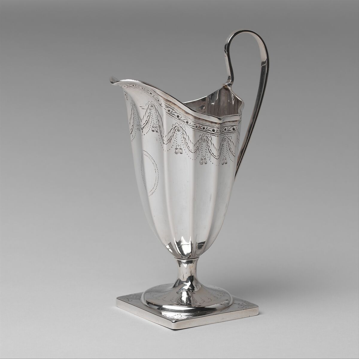 This matched set of covered sugar bowl and creamer is fashioned in the fluted Neoclassical style so popular with Revere's postwar clients. Urn-shaped sugar bowls, both plain and fluted, appear repeatedly in Revere's ledgers as "sugar urns" or "fluted sugar vases." The helmet-shaped creampot with high looped handle and square plinth also epitomizes Neoclassical taste. Each piece is engraved with bright-cut bands of tasseled swags and wavescroll ornament. According to family tradition, these objects were made as a gift for a Virginia bride.