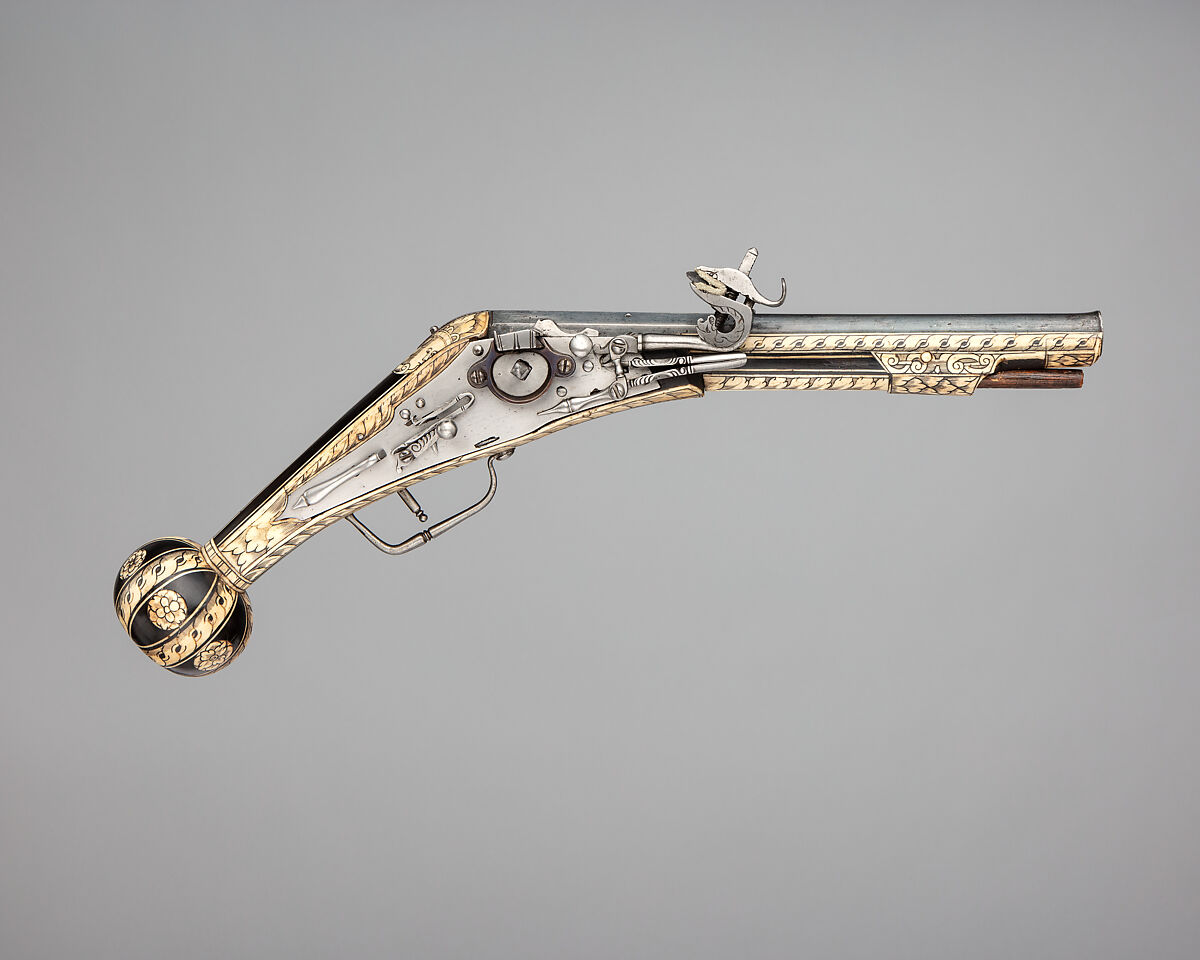 The city of Augsburg was one of the foremost arms-producing centers in Europe, and its armorers were among the first to produce wheellock pistols and carbines. Since wheellock firearms were fairly expensive, even pistols of military type, as represented by this example, rarely left the gunmaker's shop undecorated. The preferred decorative technique of German stockmakers from the sixteenth century on was the inlay of engraved staghorn plaques into the wood. Apart from the simple decorative effects of contrasting materials, use of staghorn inlays also reinforced the wooden stock, which was particularly vulnerable to the rough use of military firearms.