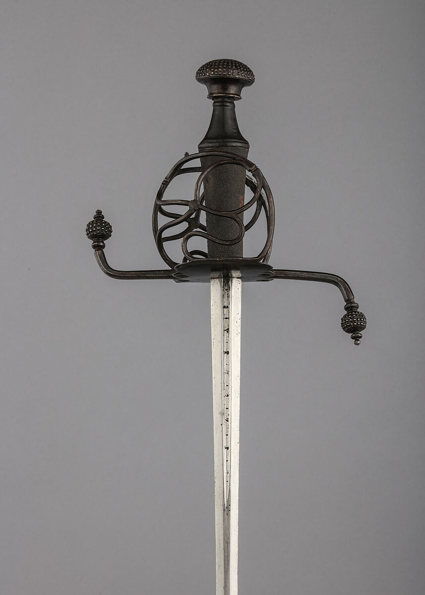 The rapier was the principal civilian sidearm throughout the sixteenth and seventeenth centuries. Designed for cut-and-thrust fencing of progressively complex techniques, the rapier is characterized by a double-edged blade with an acute point and an elaborate guard for the hand. The guards, usually of iron or steel, were subject to a variety of embellishment. They were engraved, chiseled, gilded, damascened, and encrusted in gold and silver in keeping with fashionable styles.